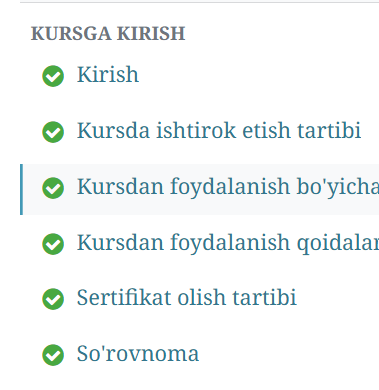 Kursdan foydalanish jarayonida bajarish holati ko'rsatib boriladi. Bajarilgan bo'limlar yashil rang bilan belgilanadi. Ular yashil chiziqcha yoki aylana ichida yashil tasdiq belgisi shaklida bo'ladi. Shuningdek, qayerga yetib kelganingizni ham ko'rsatib turadi: